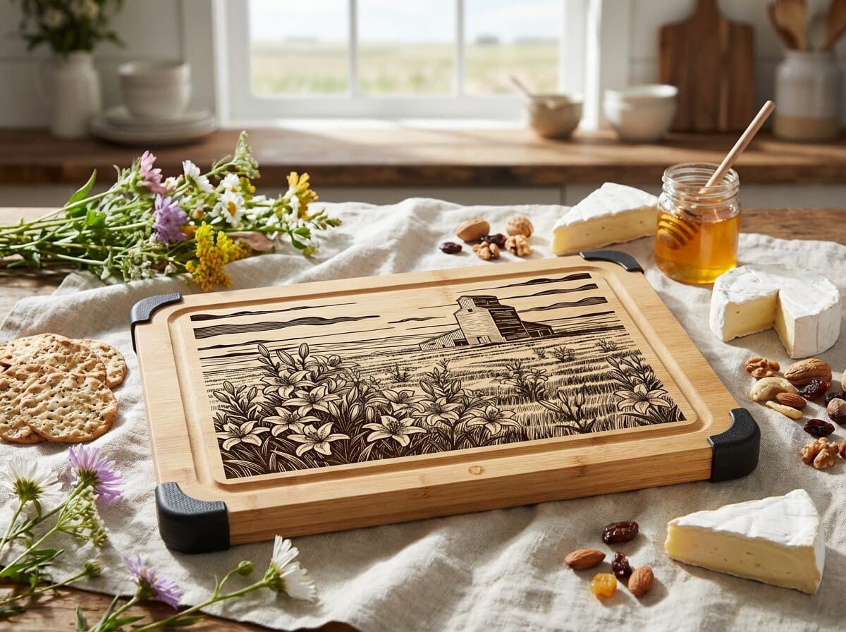 The Elevator And Lilies Cutting Board celebrates two Saskatchewan icons that define our prairie landscape. This laser-engraved bamboo beauty brings the rustic charm of grain elevators and the delicate grace of prairie lilies right to your kitchen counter.