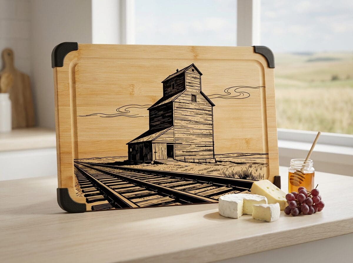 The Elevator and Train Track Cutting Board celebrates the iconic landmarks that define every Saskatchewan horizon. This laser-engraved bamboo beauty brings prairie soul right into your kitchen, where it belongs.