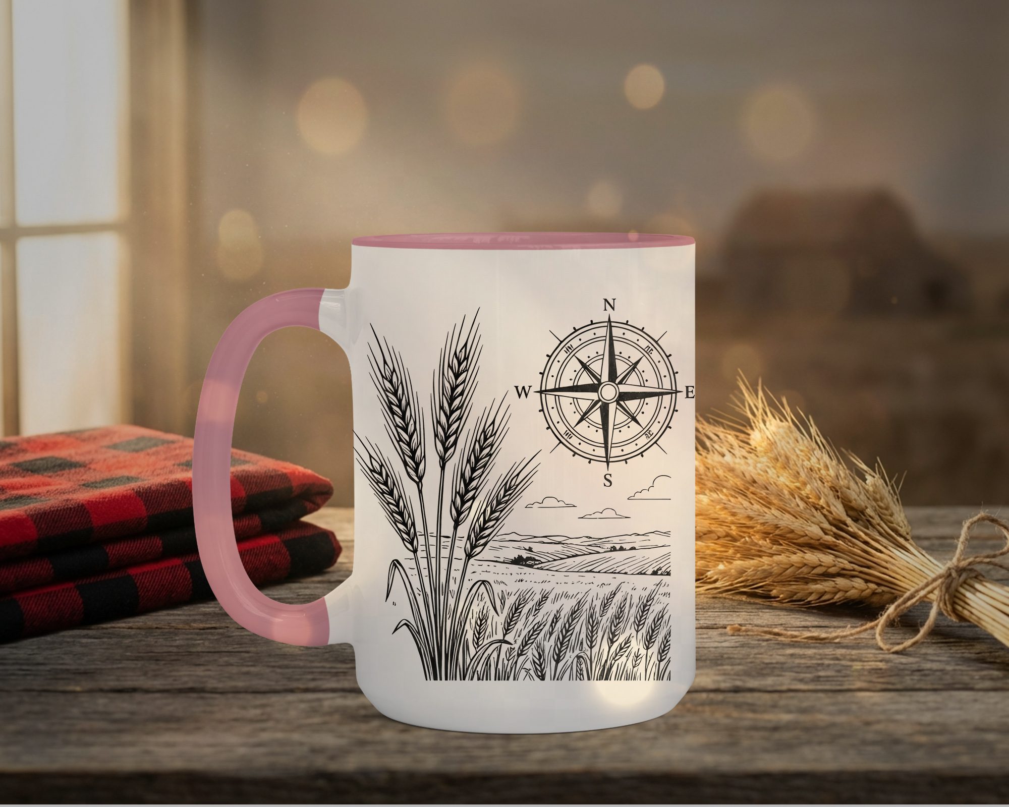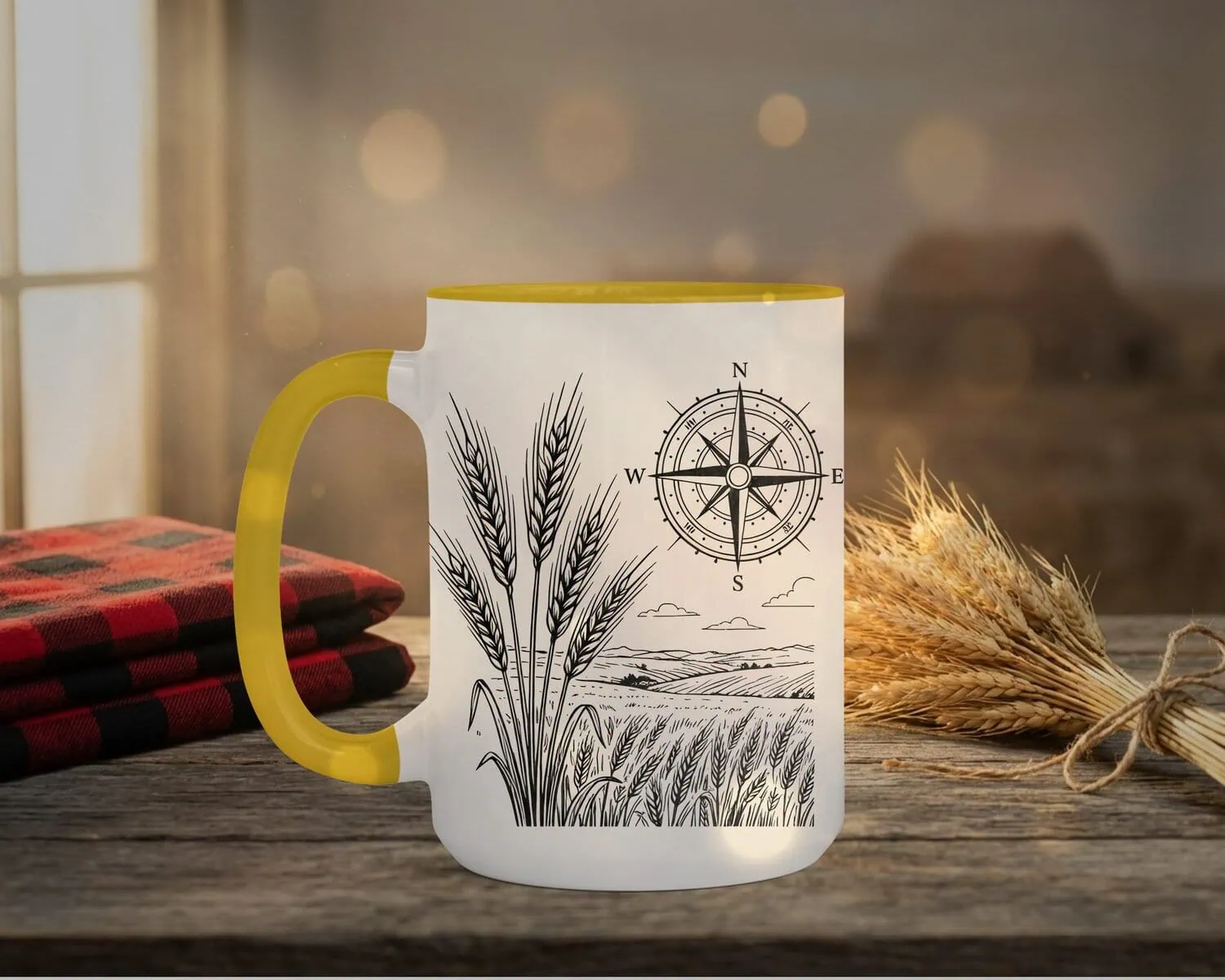 This mug is available in multiple colours including black, blue, crimson, dark green, and grey interiors with matching handles. We photograph 2-3 colour variant mockups so shoppers can see how the design looks on different backgrounds. Pick your colour and we’ll send you a digital mockup of your chosen colour before we make your Field And Compass Mug, so you can see exactly what you’re getting. No surprises, just prairie charm.